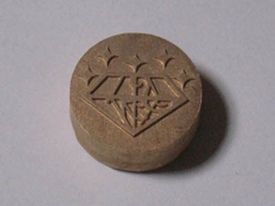 右の写真は、アクリル樹脂用に作りました焼印を厚紙に押して見たものです。アクリル板に押した時よりも細めでシャープな印影になっています。アクリル樹脂に限らず、樹脂に使用する場合には、どうしても線が太くなってしまうので、実際に印面を作る場合には、その事も考慮して印面をデザインより細くして製作するのが良いと思います。