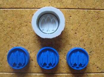 左の写真は、20ミリの直火式焼印を定期的にご注文くださるお客様のもので、写真上の白い丸い物がゴム型で、その下に3個並んでいるのが、ゴム型から作りましたワックス原型になります。