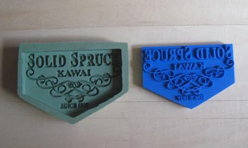 左から2番目の写真もゴム型とワックス原型になりますが、ゴム型の色が緑色になっているのがわかると思います。白いシリコンゴムより緑のシリコンゴムの方が硬いので、大型の焼印や細長い形状の焼印を複製する場合、硬いシリコンゴムを使わないと歪みが出るために、複製する焼印のデザインと大きさにより使うシリコンゴムを変える必要があるためです。