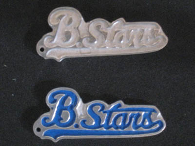 上の写真は、少年野球チームの高島ブルースターズのストラップのヘット部分です。左の上の部分は鋳造後の写真で、文字部分はエナメルを入れるために凹にしています。その下は、文字部分に青いエナメルを入れたものです。