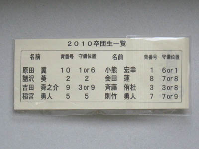 右の写真は出来上がったものを裏面から撮った写真です。卒団記念として配る為に作りましたので、卒団した年号と卒団した仲間の名前と背番号、守備位置を番号で表していれました。