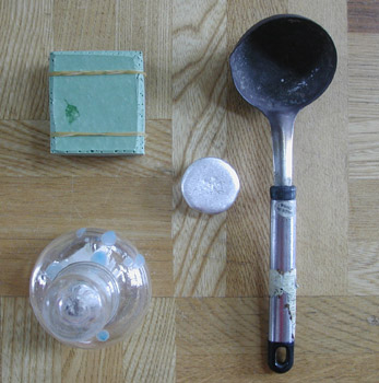 上の写真は、鋳造実験キットの画像です。左側の写真は、右から地金溶解用のお玉(この中に地金を入れて直接溶かします。)その隣は1回用の地金を小分けにしたもので、これをお玉に入れて溶かします。その隣の緑の四角いものは、シリコンゴムの鋳型で、sの下にあるのがアルコールランプです。
