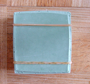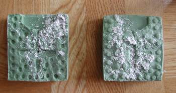 次に一番右の写真は、石膏の粉をかけてから、型を2つに重ねて少し降ってから、型を広げ余分な粉を吹いて払った状態です。