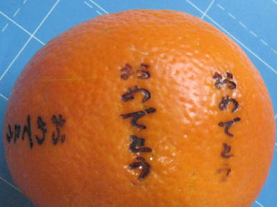 真ん中の写真は、「おめでとう」という縦長の焼印を押したものです。夏みかんの表面は球状になっていますので、縦長のデザインの焼印を押す場合には、縦方向に回すようにして押す必要がありますので、彫りの深い6ミリ彫りの焼印で試しました。果物のような、表面が球状のものに焼印を押す場合には、できるだけ深めに彫った印面で、印面の台座部分をカットしたオフセットゼロの焼印が向いています。