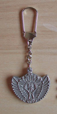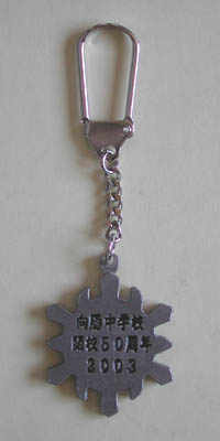 左は、小樽市立向陽中学校の校章キーホルダーの表面で、30ミリの大きさのものです。材質はホワイトメタルの低融点合金を使って、遠心鋳造により製作しております。