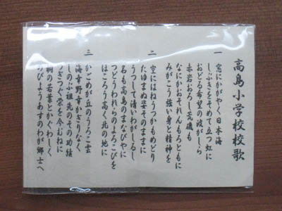 右の写真は校章キーホルダーの裏面から見たものです。高島小学校の校歌を印刷しています。